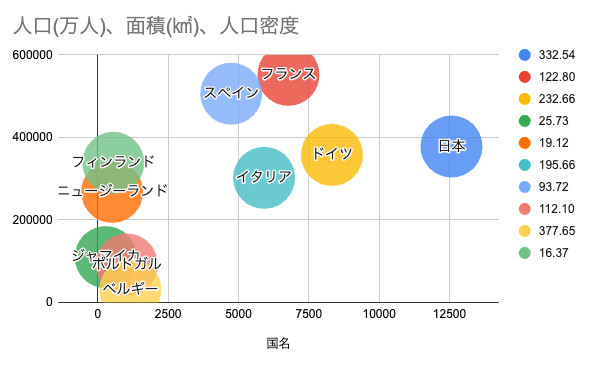 バブルチャートは3つの変数の関係を調べるときによく使われるグラフの一つです。